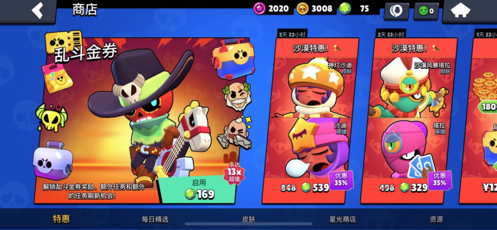 我们向右看,依次是三种货币:星光点数、金币、宝石。星光点数主要是对高杯玩家的奖励,既可以在赛季末兑换宝箱,还可以购买专属星光皮肤;金币用处很广,除皮肤外的大多数购买都是以他为媒介;宝石自不必说,是最具购买力的货币,宝石归零的我流下了贫穷的泪水。