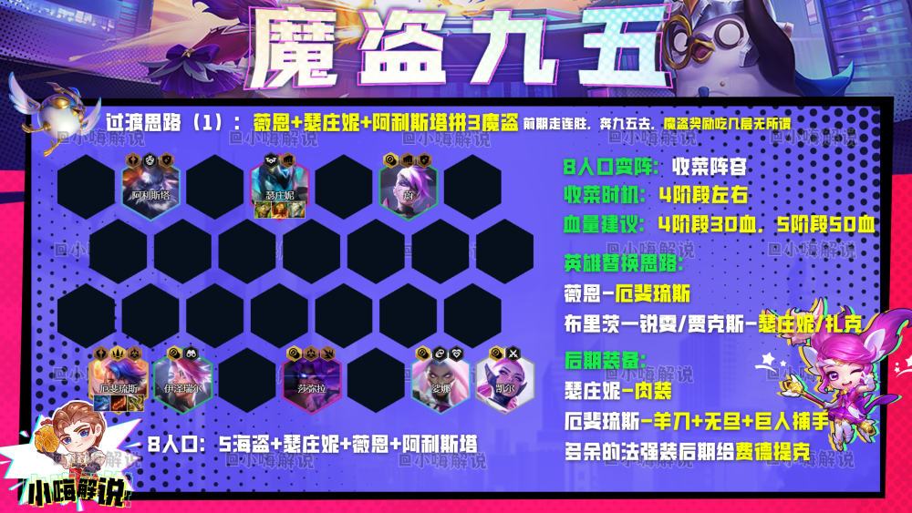 阵容运营:2-1拉4人口,2-5拉5人口,最少要在2-5阶段开出3魔盗,如果3-1阶段还没有3魔盗,那么直接不要去玩。