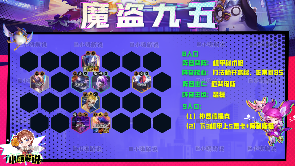 后期可以开5机甲或者5魔盗,血量容错够优先拉9人口走九五体系,血量不够就在8人口转机甲拼多多。