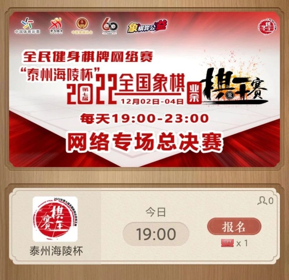 12月2日晚19点,全民健身棋牌网络赛2022年“泰州海陵杯”第七届全国象棋业余棋王赛网络专场总决赛在腾讯“天天象棋”平台开枰,年度网络专场“棋王”即将诞生。