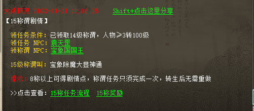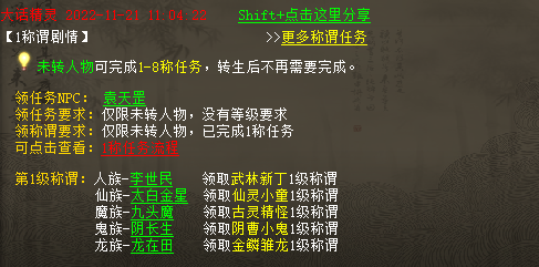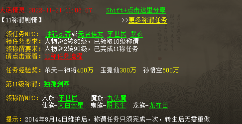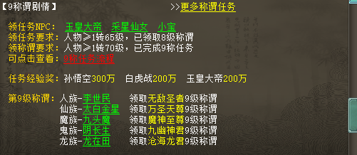1-8称:等级要求0转,以前的大话并没有那么快的节奏,虽然大家也想赶快过完剧情快点升级,但都是顺其自然杀到哪里算哪里,能单挑的决不组队,毕竟自己经过努力杀死怪物的那种成就感才是我们最初喜欢大话的唯一理由!今天杀不过第二天接着来呗!现在的新区就完全不一样了,为了赶着升级,一起都成了标准化流程了,开区过完新手就一直抓鬼,抓到66级开始过称谓,1-5称谓单挑,6-8称到了怪跟前加几个队友组队杀完,全程也就一个多小时就结束了。基本没啥游戏体验,单纯的完成任务。