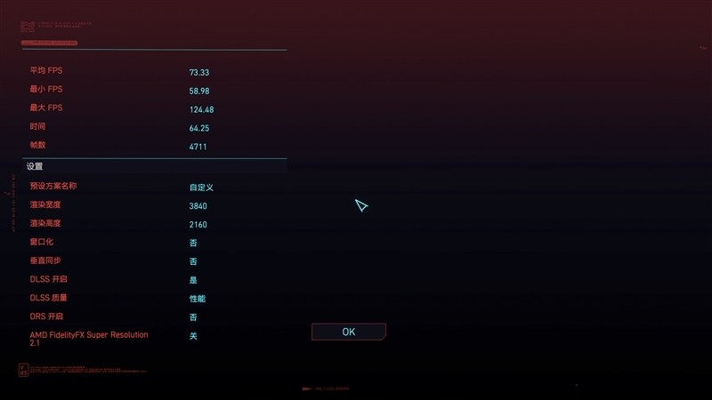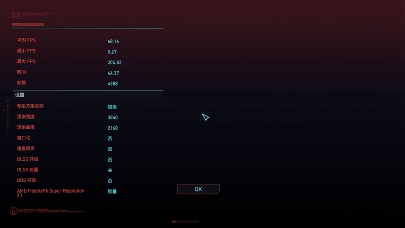 《赛博朋克》在4K+预设超级画质下,平均帧数为68.16 FPS