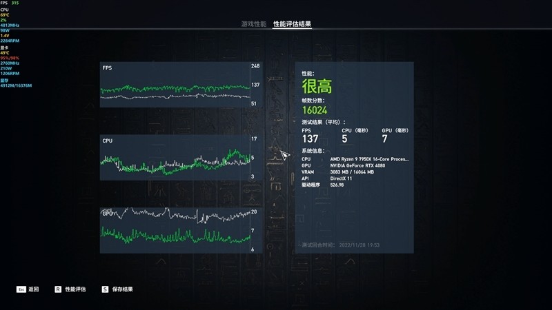 《刺客信条:起源》在2K+极高画质下,平均帧数为137 FPS。