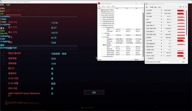 《赛博朋克2077》在2K+光追:超级画质下,当前GPU频率最高为2775MHz,最大功耗为259W,温度最高在50.5摄氏度。