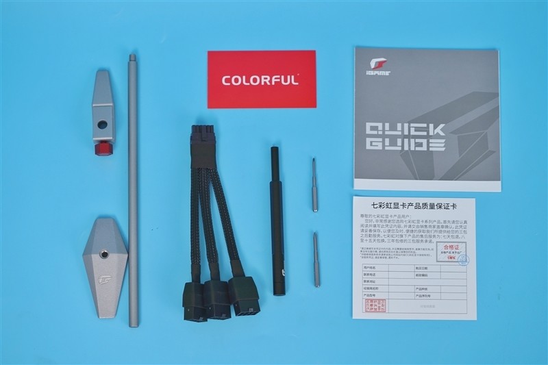 七彩虹iGame RTX 4080 Advanced OC显卡包装内附带的螺丝刀、说明书、支撑杆,还有12VHPWR转3×8PIN口的转换线。