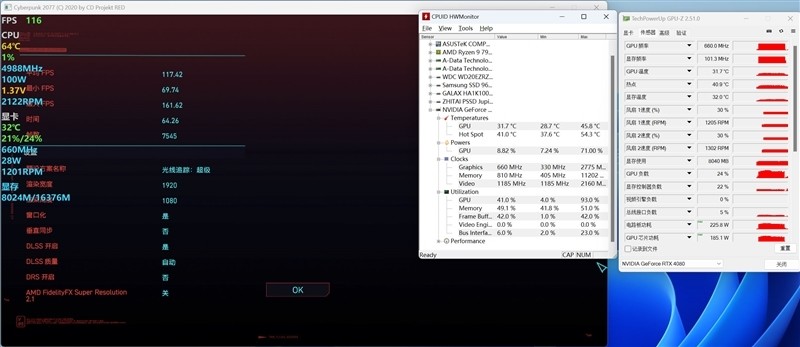 前面4K游戏测试中,《赛博朋克2077》在预设超级画质(未开启光追和DLSS)下,平均帧数为68.16 FPS。