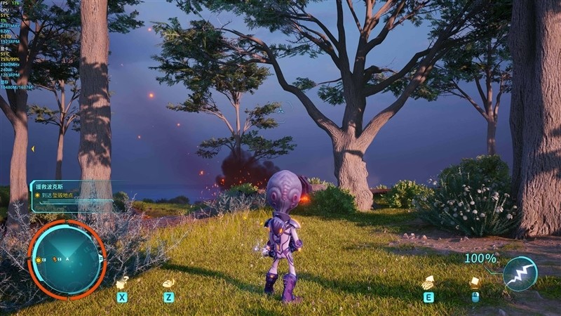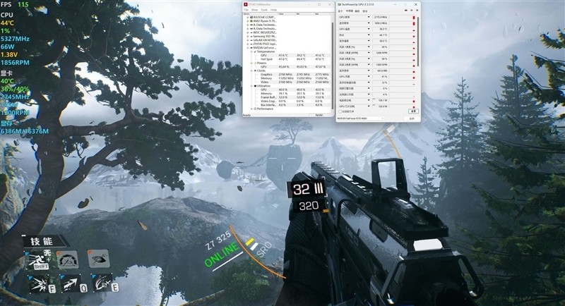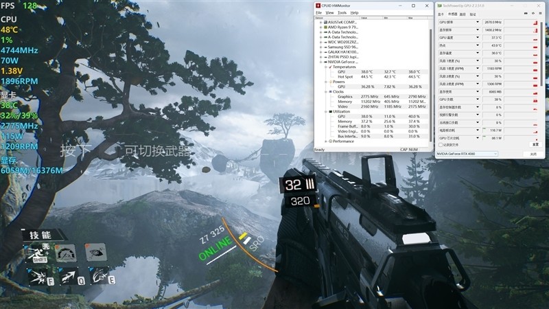《控制》在4K+最高画质下,当前GPU频率最高为2775MHz,最大功耗为176.4W,当前画面下显存最高占用43%,温度最高在41.9 摄氏度。