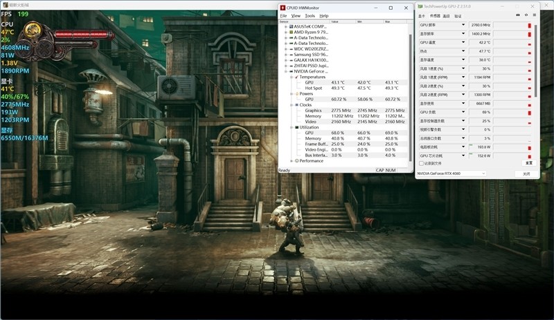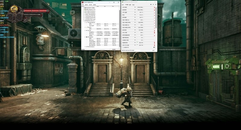 《暗影火炬城》在1080P+最高画质下,当前GPU频率最高为2775MHz,当前画面显存占用38%,最大功耗为282.4W,温度最高在49摄氏度。
