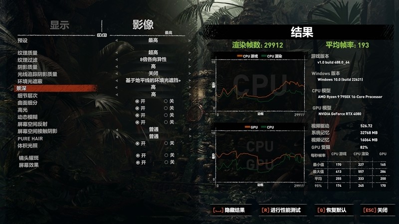 《古墓丽影:崛起》在预设最高画质(关闭光追和DLSS),平均帧数为193 FPS。