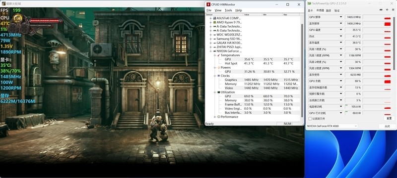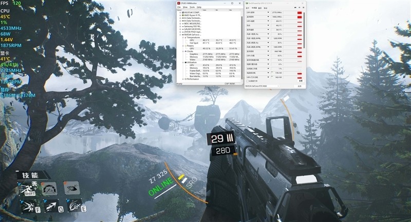 《控制》在1080P+最高画质下,当前GPU频率最高为2775MHz,最大功耗为158.1W,当前画面下显存最高占用40%,温度最高在41.6摄氏度。