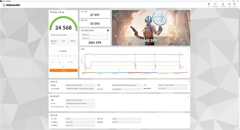 在3DMark的Time Spy(4K渲染分辨率)测试中,七彩虹iGame RTX 4080 Advanced OC显卡取得了24568的总成绩,其中显卡分数为27457。