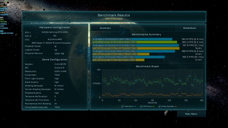 《奇点灰烬》在2K+预设最高画质下,平均帧数为182.8。