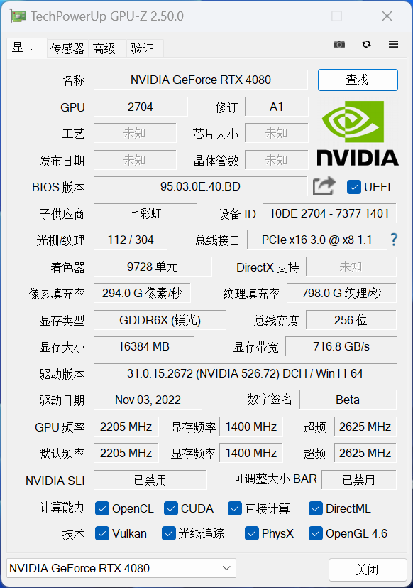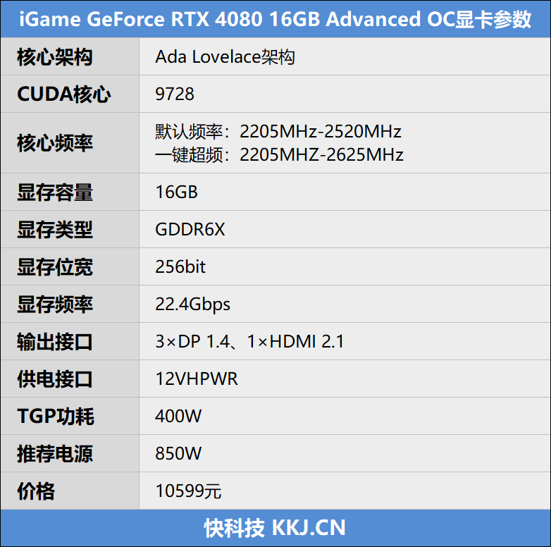 下图为七彩虹iGame RTX 4080 Advanced OC显卡的规格参数: