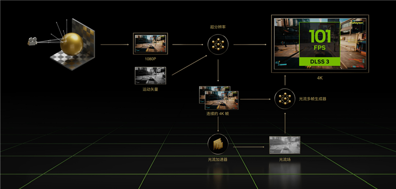 RTX 40系列显卡通过工艺和架构上的改进,带来了全新的DLSS 3技术,基于光流加速器和AI技术,使用革命性的光学帧生成技术,能够预测场景中帧和帧之间的运动变化,进行智能“插帧”,从而提高游戏帧率,并保证足够的画质。