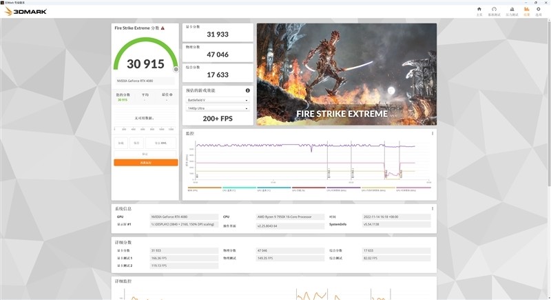在3DMark的Fire Strike Extreme(2K渲染分辨率)测试项目中,七彩虹iGame RTX 4080 Advanced OC显卡取得了30915的总成绩,其中显卡分数为31933。