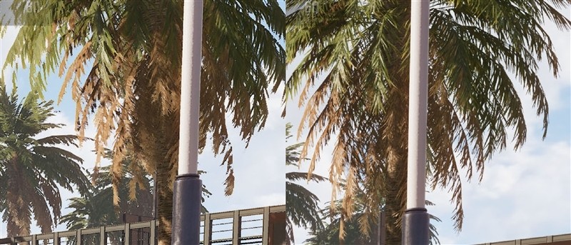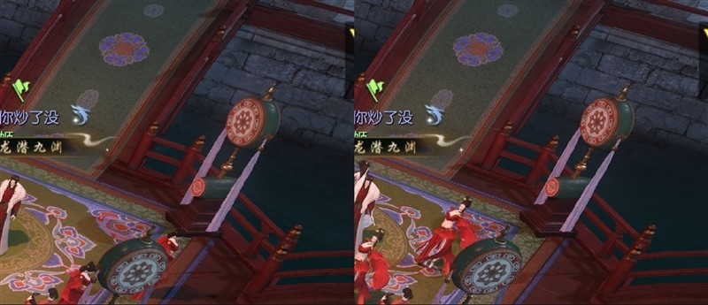 可以看到,因为DLSS参与补偿计算,《逆水寒》相同场景的鼓面花纹清晰度、《超级人类》的棕榈树树叶的细节,都要比原生画质更为好一些。