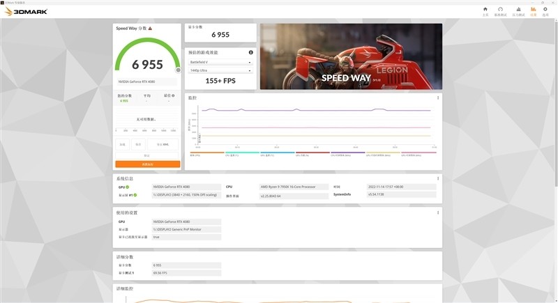 在3DMark的Speed Way(2K渲染分辨率)测试项目中,七彩虹iGame RTX 4080 Advanced OC显卡取得了6955的总成绩。