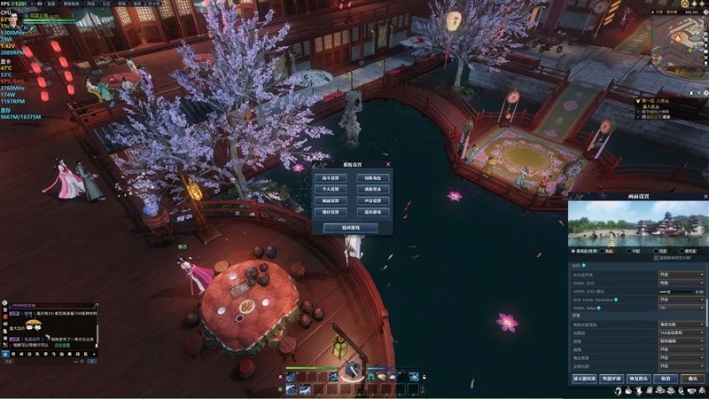 《逆水寒》中,在4K+最高画质基础下,开启光追和DLSS,同时打开DLSS帧生成、NVIDIA Reflex,DLSS模式为性能,当前游戏场景帧率为123 FPS,提升了105%。