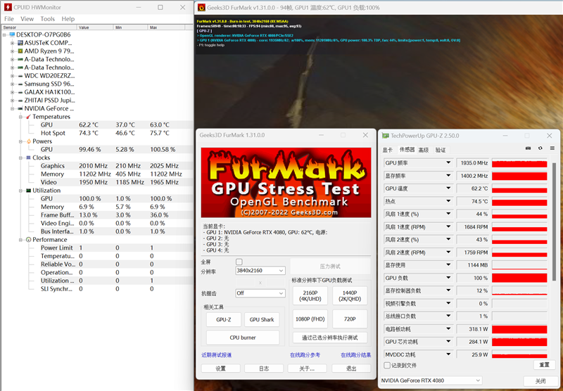 在整个烤机过程中,七彩虹iGame RTX 4080 Advanced OC显卡的功耗稳定在320W左右,GPU频率此时在2010MHZ,Boost时可达2025MHz,温度在62.2度左右,风扇转速在1700~1800 RPM左右。
