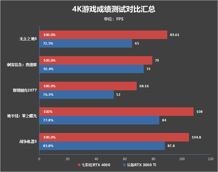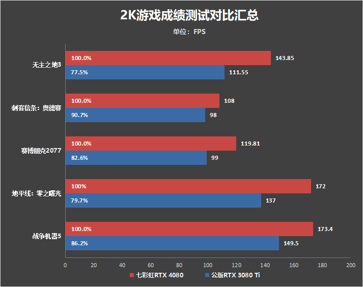 在2K分辨率下的对比,提升较小的同样是《刺客信条:奥德赛》,只有10.2%,其它游戏在七彩虹iGame RTX 4080 Advanced OC显卡均得到了16%~29%的性能提升。