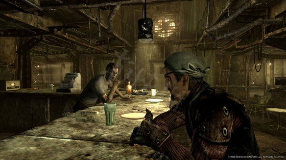 当然,绝大多数玩家根本不会在乎这个,只希望能够尽快投入这个世界就可以了。然而,我认为,对于一个RPG游戏来说,一个来自两百年前的人,究竟会怎样认识、接受、理解、习惯这个与他/她所来自的那个世界(在那个世界里有秩序、干净整洁的住房和电视转播的棒球比赛)完全不同的废土,本来是一个值得大书特书的题材,但B社的编剧根本没有在这方面用心。玩家在刚回到老家的时候,碰见历经两百年沧桑依然坚守岗位的机器管家时,我本来以为机器管家会向主角介绍一下这个世界变成了什么样子,但机器管家只是跟主角讲了这个世界已经过去了二百年,把主线转移到康科德之后就去找食物了,并没有教给主角任何有关废土的有用的信息。