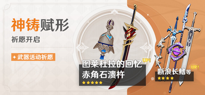 ●活动期间,可使用「神铸定轨」对本期五星UP武器「法器·图莱杜拉的回忆」或「双手剑·赤角石溃杵」进行定轨,更多「神铸定轨」详细规则可点击祈愿界面左下角【详情】按钮进行查询。
