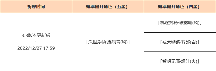 ●活动期间,四星角色「机逐封秘·珐露珊(风)」「戎犬锵锵·五郎(岩)」「智明无邪·烟绯(火)」的祈愿获取概率将大幅提升!