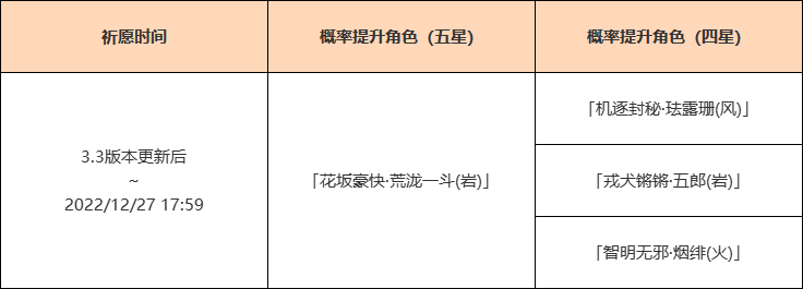 ●活动期间,限定五星角色「花坂豪快·荒泷一斗(岩)」的祈愿获取概率将大幅提升!