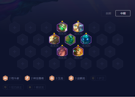 3-2升六人口,补充羁绊不d卡,如果有狗熊可以上三金鳞贪经济,前中期的狗熊搭配玉龙非常强势。