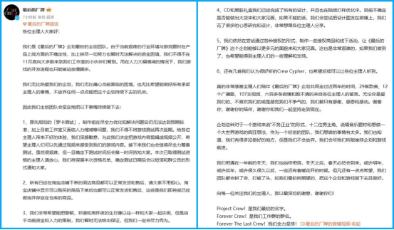 12月2日,由上海阿佩吉网络(APG GAMES)研发的乙女卡牌游戏《最后的厂牌》发布长文,表示由于当前艰难的行业环境与产品上线的不确定性,加上暂时无法解决的资金困境,不得不大幅缩减人力,暂缓游戏开发进程。