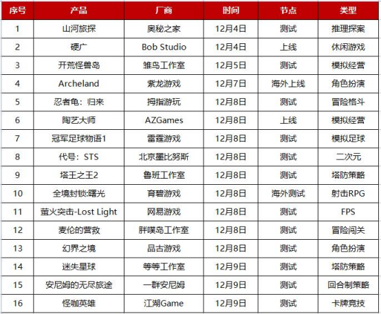 下周预计有16款产品测试或上线,其中包含网易游戏、雷霆游戏、育碧、拇指游玩等多家厂商新作。产品类型多样,包括模拟经营、二次元、角色扮演等多品类。
