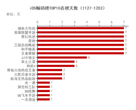 本周(1127-1203)共计18款产品登上过iOS畅销榜TOP10,其中《王者荣耀》《和平精英》《英雄联盟手游》《原神》《梦幻西游》《三国志·战略版》《捕鱼大作战》7款产品达成在榜7天成就。