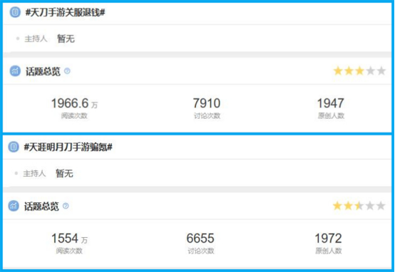 11月末,《天涯明月刀手游》对游戏内的“天衣惠选机制”进行更新,但更新之后因活动概率不清晰、延期活动时间等原因,受到部分玩家抵制,在微博发起“天刀手游关服退钱”、“天涯明月刀手游骗氪”等超千万阅读的热门话题。