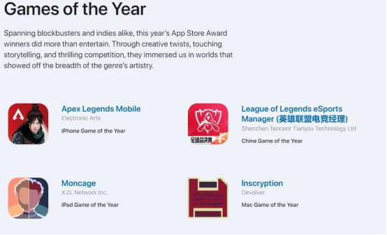 在苹果2022年App Store Awards得奖游戏中,《英雄联盟电竞经理》获得中国年度最佳游戏;《Apex英雄》手游获得年度iPhone游戏。