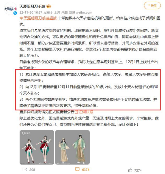 针对玩家集中反馈,《天涯明月刀手游》官博对此进行了公开道歉,表示考虑到玩家的呼声与合理诉求,决定在原本规则基础上进行优化,包括但不限于对玩家进行游戏道具补偿,降低抽奖次数等等。