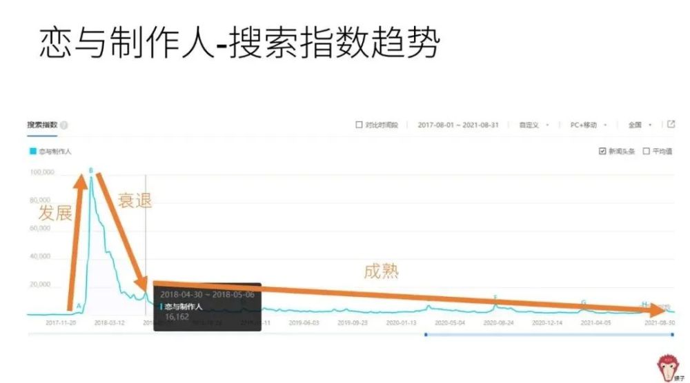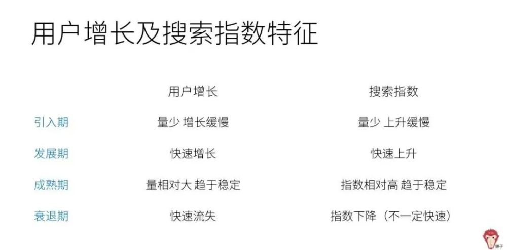 前面在介绍生命周期阶段特点时,我们已经了解了各阶段的用户增长特点;搜索指数特征也类似: