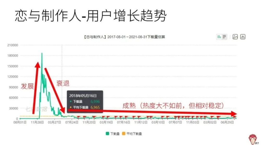 恋与制作人的搜索指数曲线和用户增长曲线趋势相近,17年12月-18年5月快速完成了发展和衰退期,后续日搜索量大多保持在2千以上,可以判定为衰退后的成熟期。