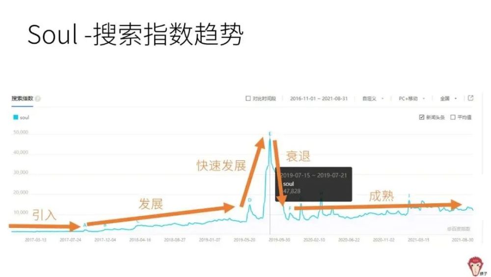 再举个例子:通过用户增长和搜索曲线没有完全确定soul的目前阶段,二者存在分歧。这也需要我们分析产品及市场信息。