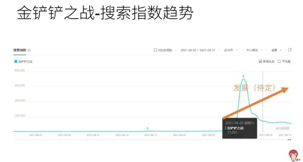 8月26日是产品正式上线的时间,因此出现搜索峰值合理。初步判定金铲铲之战从上线至今依然处于发展期,也可以结合其他信息进一步验证。