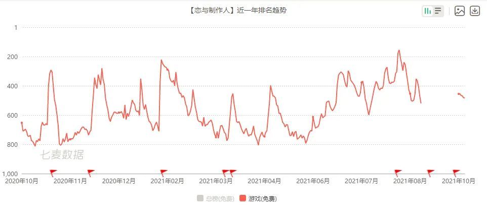 数据显示,恋与制作人在游戏类app的下载排名稳定在800名之前,近一年平均日收入在3万美元以上,且产品保持相对稳定的更新频率(红色小旗帜)。