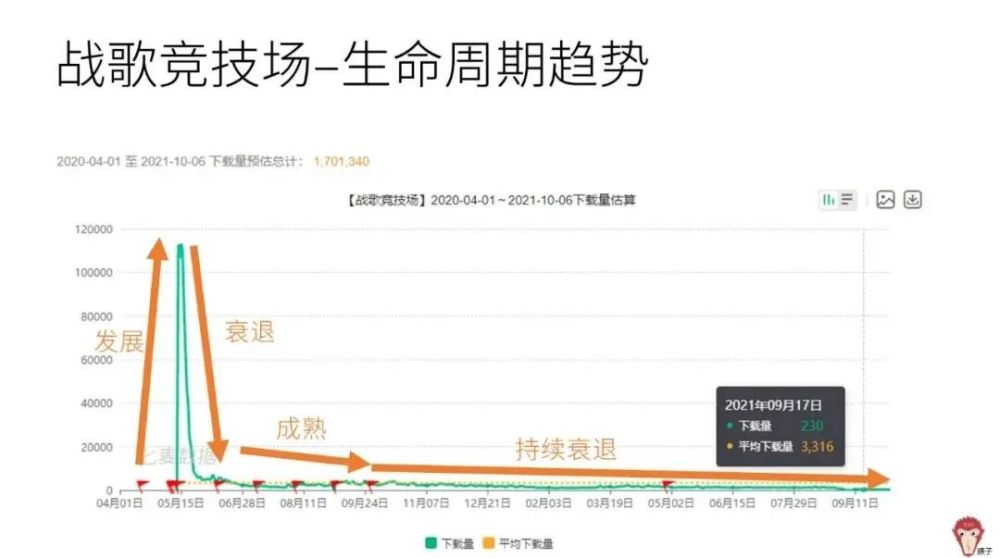 战歌竞技场起点很高,但快速成长的趋势持续不到一个月,随后出现冷却。经历了3-4个月相对稳定的成熟期后,产品衰退,版本更新成了奢望。