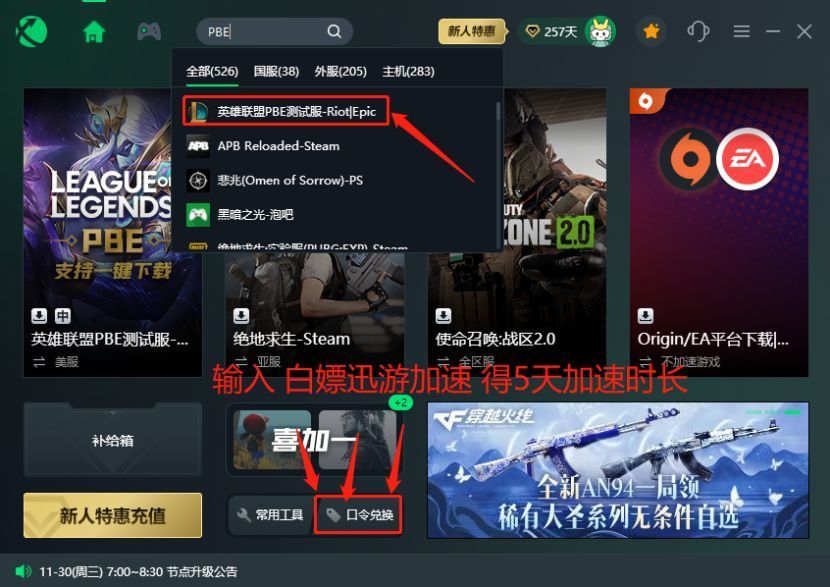 1. 众所周知英雄联盟pbe测试服只有美服,并没有国服,所以我们需要加速 器的帮助才能顺利下载和进行游戏。打开迅游加速 器对pbe测试服进行加速,没有加速时长的小伙伴点击下图所示口令兑换进入之后输入【白嫖迅游加速】可得5天加速时长。