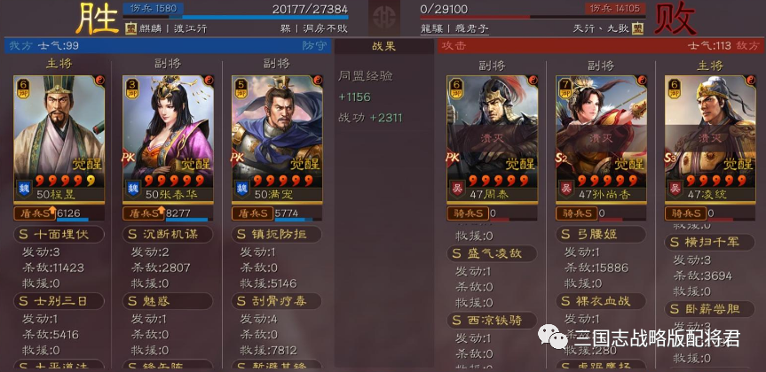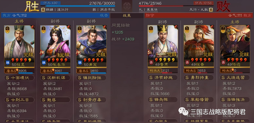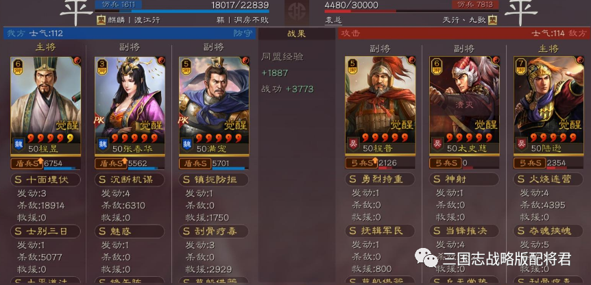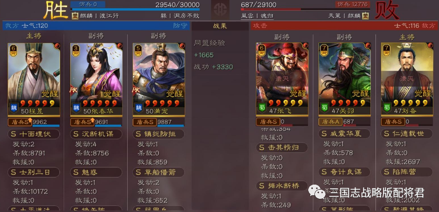 总结:看完各种吊打满红的战报,大家是不是心动了呢?其实在游戏中,程昱和春华都是比较容易抽到的,很多微氪玩家都拥有足够的红度,那么不妨组一套出来!个人感觉这是在群雄剧本里为数不多能达到稳稳T0的阵容,强度完全不比公认的盾兵天花板的吴盾弱!