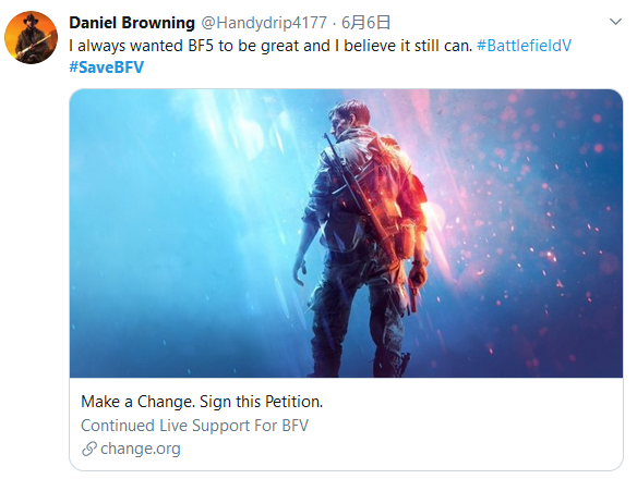 也是因为7.0版本更新让玩家们觉得这游戏有救,一些海外玩家最近开始在推特上通过标签“#SaveBFV(救救《战地5》)”发起声援运动,万人血书求DICE继续更新,可惜DICE要去做《战地6》了没有鸟他们