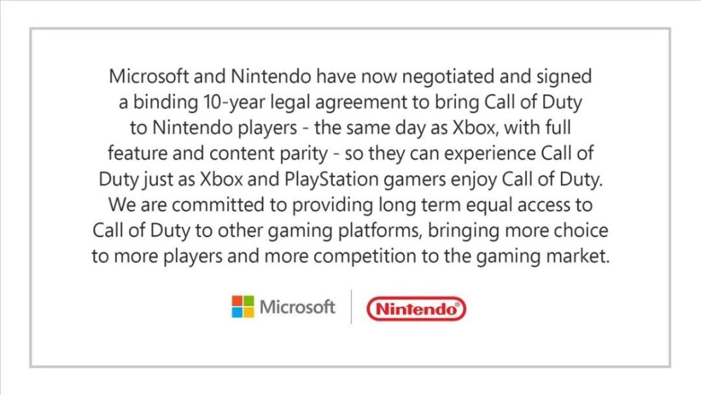 此前,微软就为索尼提供了一份合同,保证即便收购动视暴雪后也会给PlayStation长期提供《使命召唤》等游戏,同时微软也给任天堂、Valve提供了内容类似的合同,以表明自己不会把《使命召唤》变成Xbox独占游戏。但是索尼拒绝了这个提议,Valve则表示信任微软而不签署这个合同,只有任天堂还没有回应,直到现在。