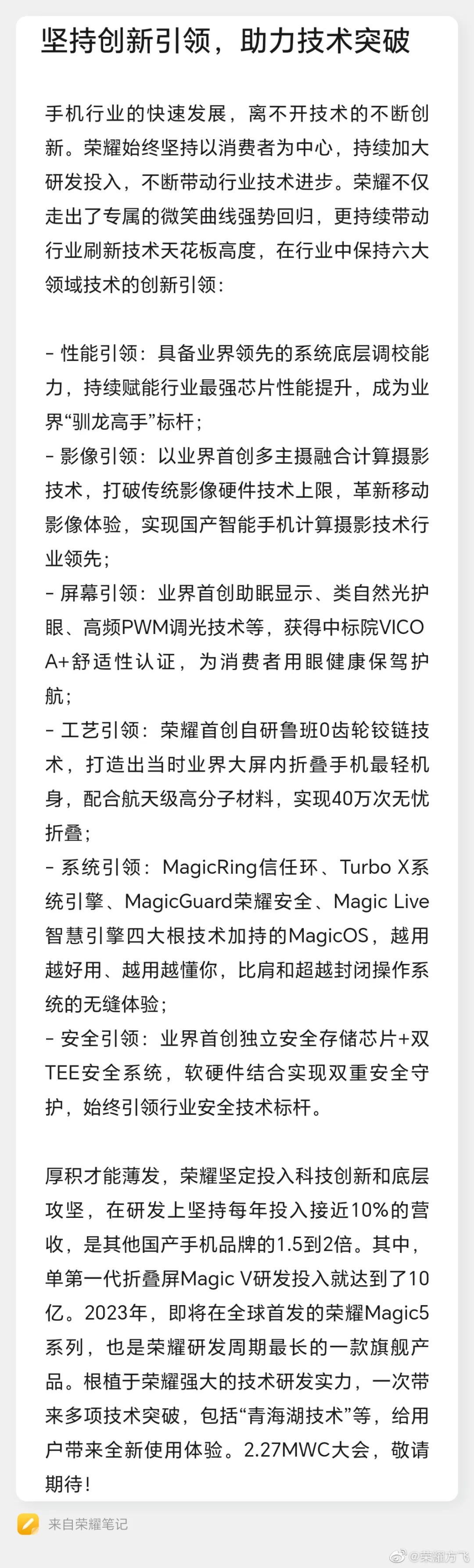 此外,荣耀方飞还指出,荣耀Magic5系列是荣耀研发周期最长的一款旗舰产品,在性能、影像、屏幕、安全等方面引领行业。