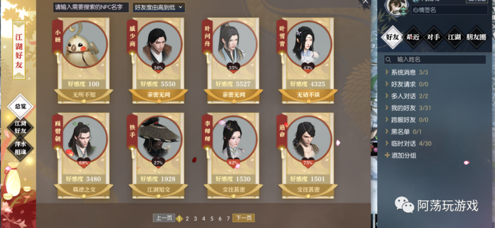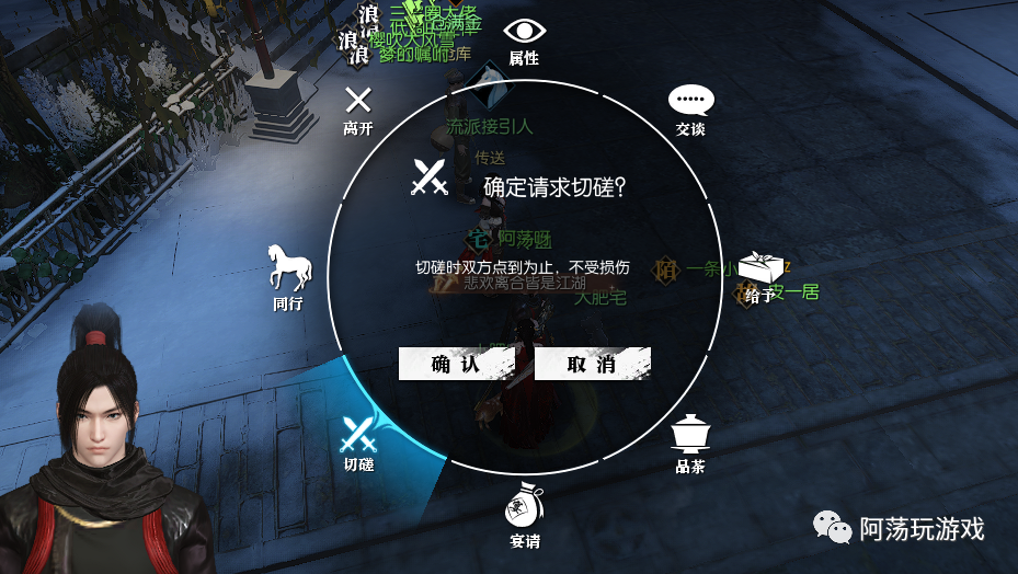 部分NPC与他切磋赢了同样涨好感度,每天一次。最后就是同行,部分NPC的同行有结伴同游,这个一次是100+的好感度。