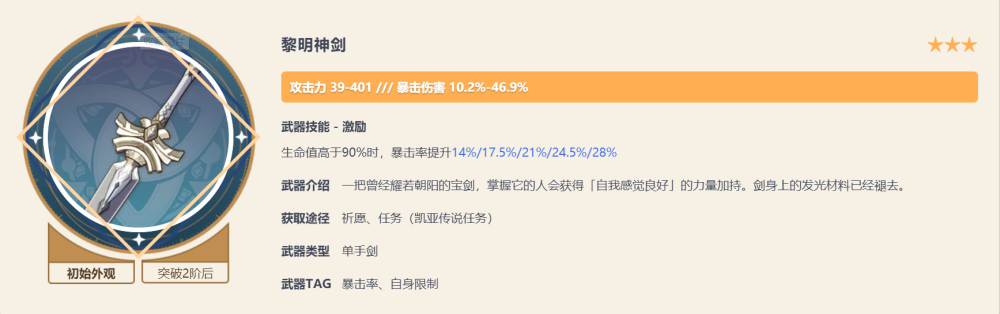 不出意外的话,这应该是玩家最先得到的几把三星武器之一了。当时凯亚的传说任务中,他神秘兮兮地和我们说有一把家传的宝贝,结果我们忙活了半天,最后他就给了我们一把这个黎明神剑。