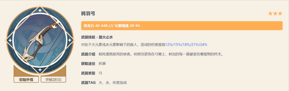 如果说3.0之前,这把弓只能给@这把我们就遇到高手来降魔用,那么3.0之后这把弓就是种门的强力武器了。种门并不依赖攻击力,所以94的元素精通还算够用,额外24%的增伤通用程度也挺高,这把武器在前期还是不错的选择,后期的话可以换成绝弦来提供更高的元素精通,或者选用西风猎弓来提供充能。