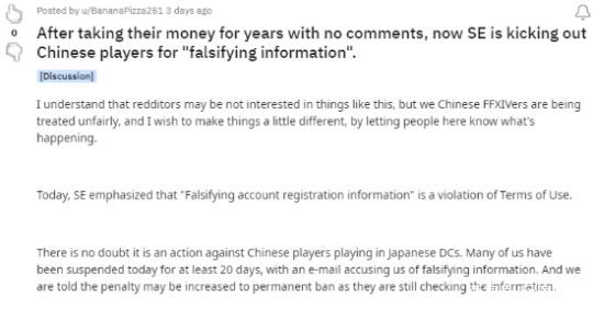 公告发布后,引发了玩家的大量讨论,因为很多非服务地区,欧盟或日本的玩家为了能建立一个账户并进行游戏都使用了假的地址,论坛上有玩家表示自己已经被封了20天,而官方仍在检查账户信息,“伪造账户注册信息”的处罚有可能面临永久封禁。或许SE接下来还将有更多处理违规章使用者的措施。近期国际服的玩家一定要注意自己填写信息的真实性了。